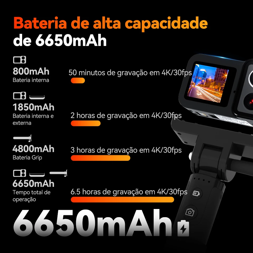 Bateria embutida (800mah) + bateria externa (1050mah) + alça renovável (4800mah), suporte de design de bateria tripla, uso externo sem se preocupar com a vida útil da bateria.A bateria integrada atende ao disparo em quadros 4K30 por cerca de 50 minutos.Bateria integrada + externa Atende ao disparo em quadros 4K30 por cerca de 2 horas.Resistência da lente HD do bastão de selfie portátil: 4K30fps pode ser usado continuamente por cerca de 3 horas, resistência da lente de visão noturna do bastão de selfie portátil: 4K30fps pode ser usado continuamente por cerca de 5 horas 30 minutos